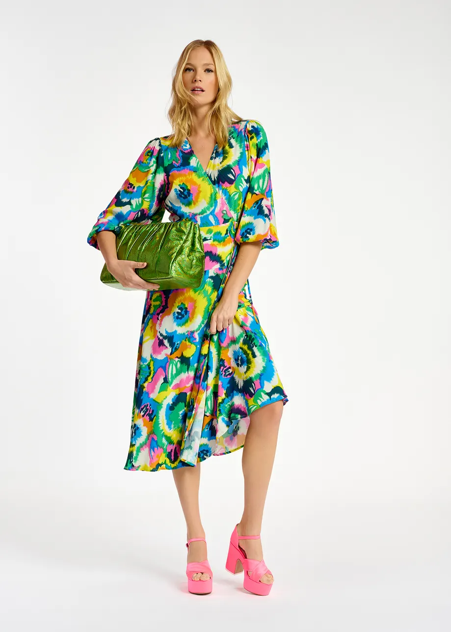 Multicolor floral print midi-length wrap dress