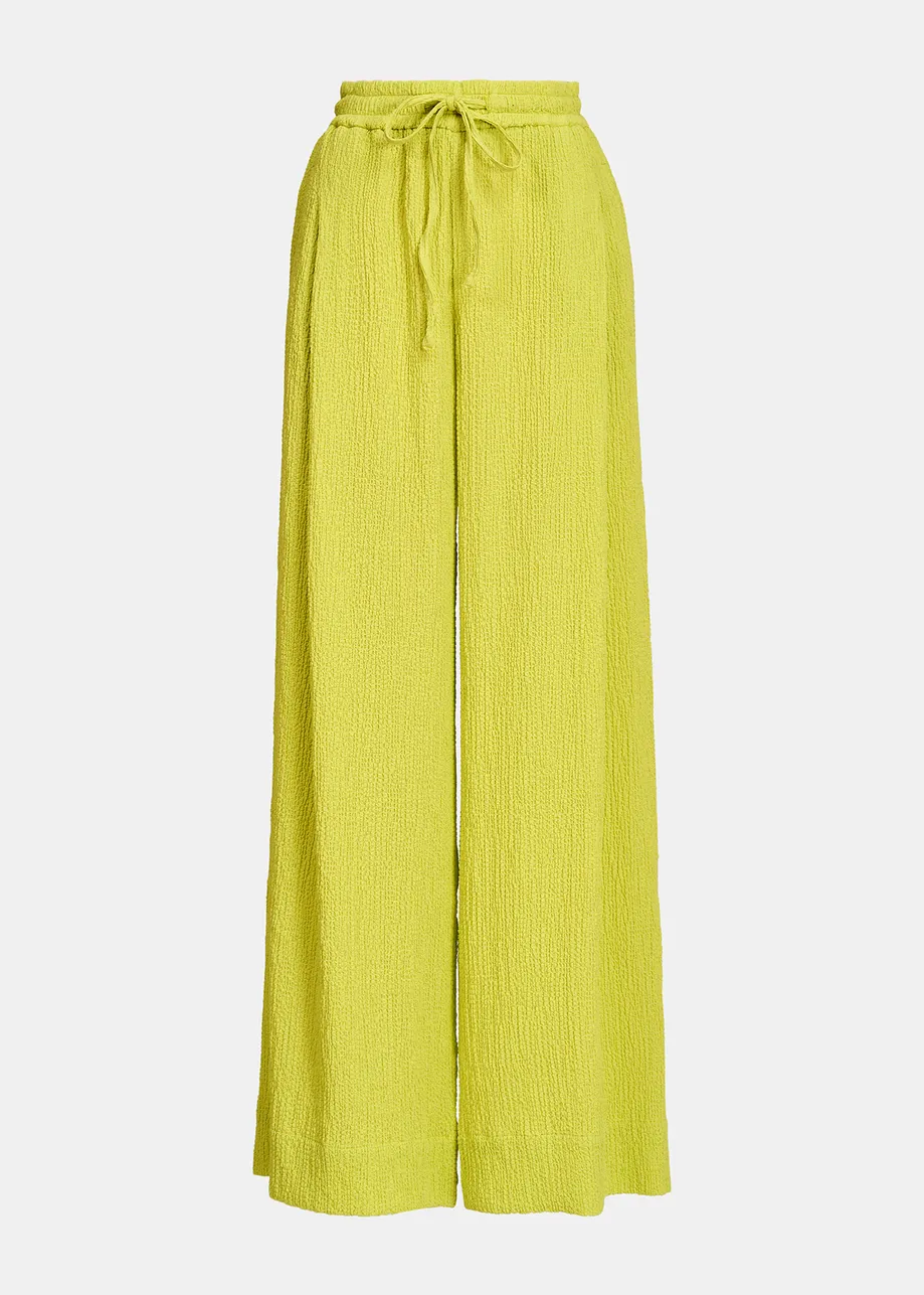 Wide-legged pair of pants are cut from a slightly stretchy seersucker fabric with a textural finish. They sit comfortably high at the waist and easily adjust for the perfect fit thanks to the drawstring fastening.